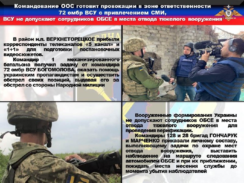 ♦️Примечательно, что в указанном районе наблюдатели Миссии дважды пытались осуществить полет, но в виду работы комплексов РЭБ противника, осуществить мониторинг так и не удалось. По поступившей информации, активная работа станций РЭБ ВСУ связана с прибытием в район н.п. ВЕРХНЕТОРЕЦКОЕ корреспондентов ДВУХ телеканалов «5 канал» и «1+1» для подготовки постановочных видеосюжетов. Командир 1 механизированного батальона получил задачу от командира 72 бригады БОГОМОЛОВА, оказать помощь украинским пропагандистам и осуществить обстрел своих позиций, выдавая его за обстрел со стороны Народной милиции.