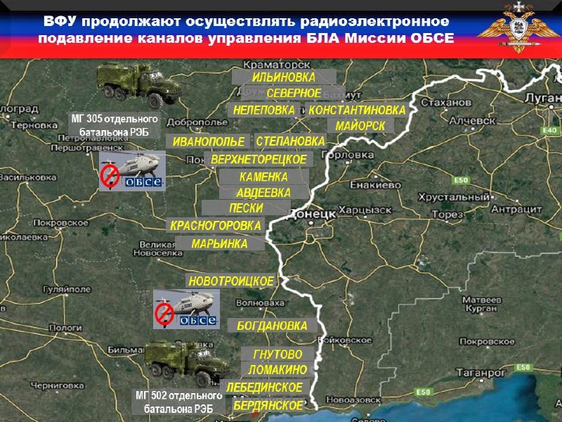 ❗️За неделю зафиксировано ДВАДЦАТЬ ВОСЕМЬ фактов подавления каналов управления и навигации БПЛА наблюдателей СММ ОБСЕ вдоль всей линии боевого соприкосновения, в районах населенных пунктов: СЕВЕРНОЕ, ИЛЬИНОВКА, АВДЕЕВКА, МАРЬИНКА, НОВОТРОИЦКОЕ, СТЕПАНОВКА, КОНСТАНТИНОВКА, НЕЛЕПОВКА, ПЕСКИ, ВЕРХНЕТОРЕЦКОЕ, МАЙОРСК, ГНУТОВО, ЛОМАКИНО, ИВАНОПОЛЬЕ, КАМЕНКА, КРАСНОГОРОВКА, БОГДАНОВКА, ЛЕБЕДИНСКОЕ и БЕРДЯНСКОЕ.