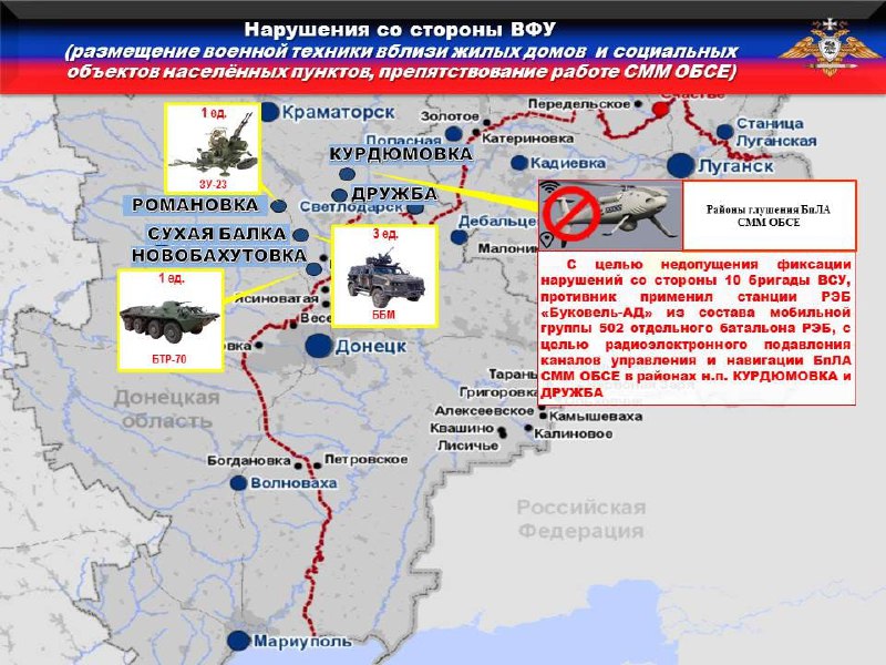 🚫Украинская сторона продолжает блокировать работу БпЛА СММ ОБСЕ. Так, с целью недопущения фиксации нарушений со стороны 28, 93 и 128 бригад ВСУ, противник применил станции РЭБ «Буковель-АД» из состава мобильных групп 305 и 502 отдельных батальонов РЭБ, с целью радиоэлектронного подавления каналов управления и навигации БпЛА СММ ОБСЕ в районе н.п. ЖЕЛАННОЕ ВТОРОЕ, ФЕДОРОВКА и ОРЛОВСКОЕ.