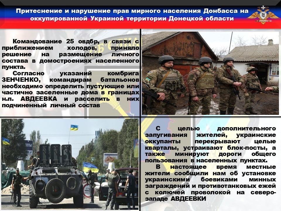 ⚠️Согласно указаний комбрига ЗЕНЧЕНКО, с целью недопущения гибели и ранения личного состава, уничтожения военной техники, а также сохранения здоровья в условиях снижения среднесуточной температуры, командирам батальонов необходимо определить пустующие или частично заселенные дома в границах н.п. АВДЕЕВКА и расселить в них подчиненный личный состав.