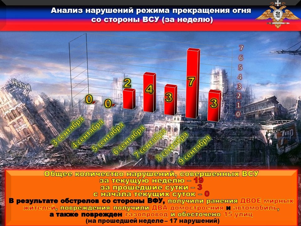 8 сентября боевики 58-й бригады обстреливали из 120-мм минометов н.п. ВЕСЕЛОЕ и ДОНЕЦК, выпустив ТРИДЦАТЬ ШЕСТЬ мин. В результате обстрела ранения получили двое мирных жителей. Также были повреждены три жилых дома и обесточен вентилятор главного проветривания…