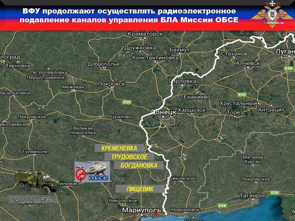 ‼️За неделю зафиксировано ЧЕТЫРЕ факта подавления каналов управления и навигации БпЛА наблюдателей СММ ОБСЕ вдоль линии боевого соприкосновения, в районах населенных пунктов: БОГДАНОВКА, КРЕМЕНЕВКА, ТРУДОВСКОЕ и ПИЩЕВИК