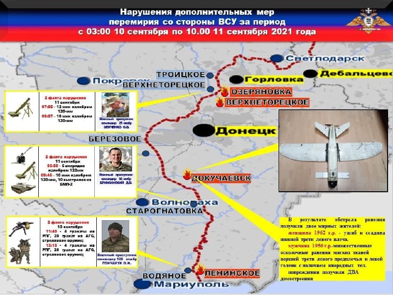 Международные наблюдатели продолжают фиксировать военные преступления ВСУ против мирного населения. Так, в отчете от 9 сентября 2021 года, наблюдатели подтвердили факт ранения мирного жителя г. Донецк, в результате обстрела 29 августа 2021 года с позиций 28 бригады.