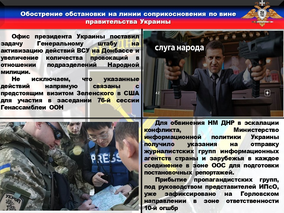 ❗️С целью обвинения Народной милиции в эскалации конфликта, Министерство информационной политики Украины получило указания на отправку журналистских групп ведущих информационных агентств страны и зарубежья в каждое соединение в зоне ООС для подготовки постановочных репортажей. Прибытие пропагандистских групп, возглавляемых представителями подразделений ИПсО, уже зафиксировано нами на Горловском направлении в зоне ответственности 10-й огшбр.