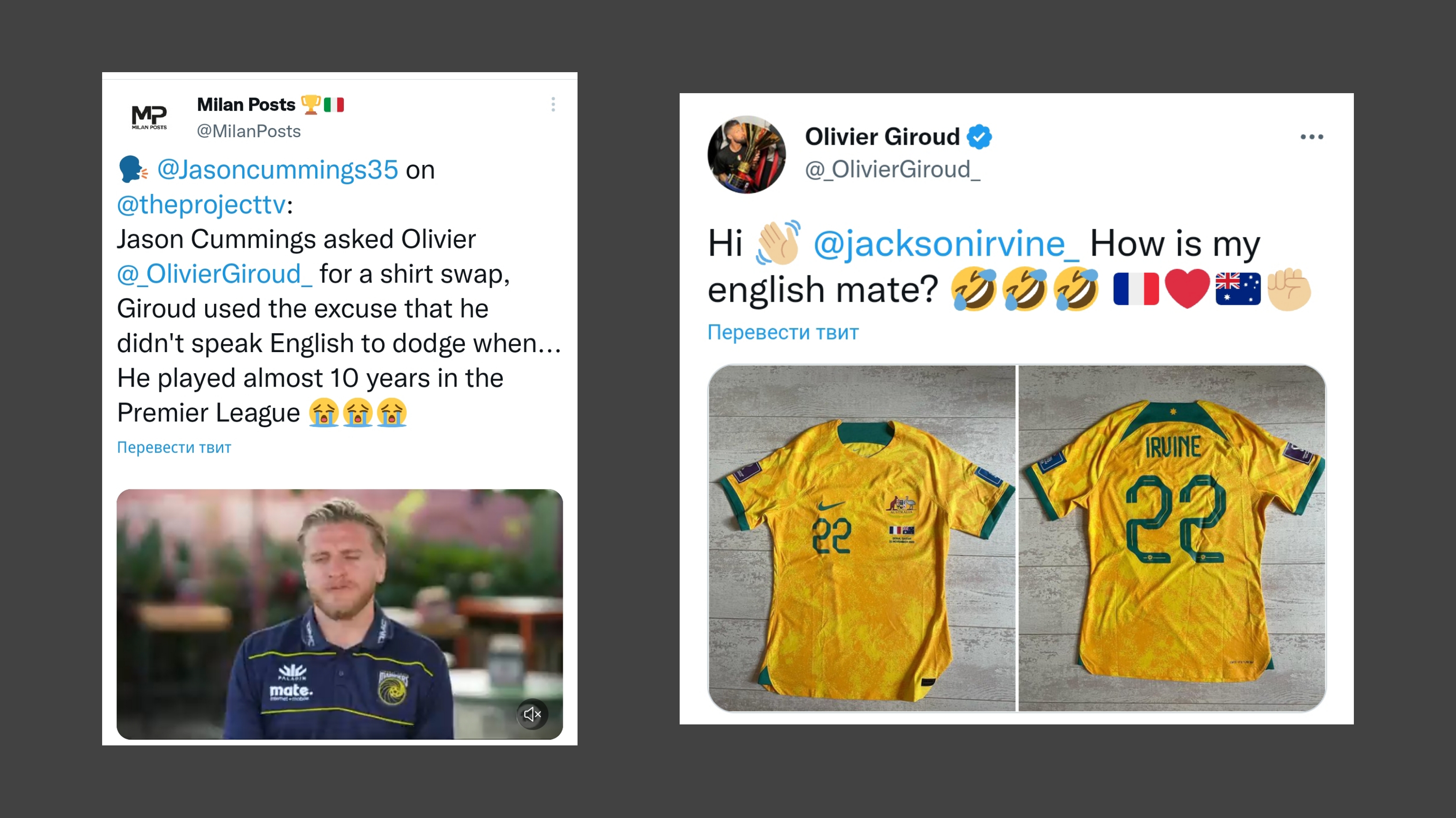 По словам Каммингса, после игры ЧМ Австралия — Франция (1:4), он хотел поменяться футболками с Мбаппе, но по пути в раздевалку встретил Жиру.