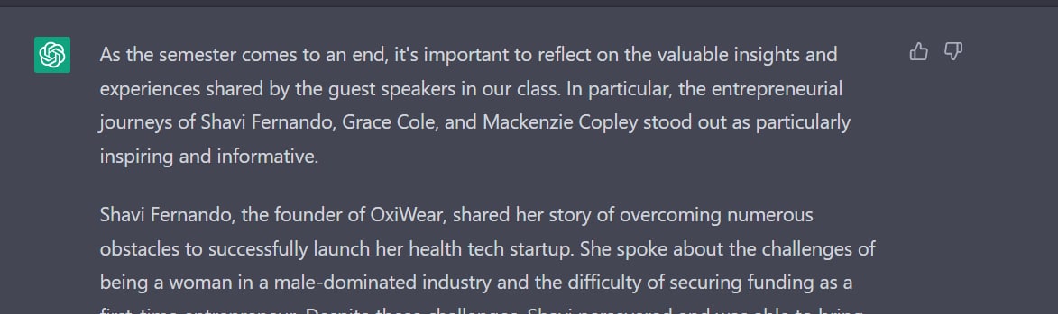 Attached picture is the first paragraph of the discussion post for my class created by chatGPT.