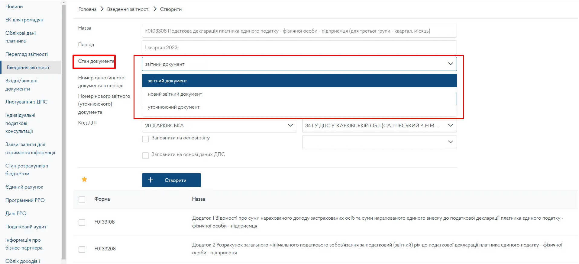 Щоб замість звітної надати звітну нову або уточнюючу декларації в електронному кабінеті, перед тим як натиснути кнопку «Створити», необхідно змінити її тип так, як це показано на цьому скриншоті: