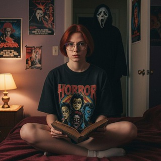 There's makeup laying around her. The walls have scary movie posters. A man in a ghostface costume should be behind her staring at her, his body should be dimly lit, and he should be standing in the doorway of a dimly lit hallway. the background behind he should be slightly dark and ominous. Do not alter facial featuresОчень понравилось, что хорошо переданы именно мои черты лица, взятые с фото. Редко, когда получалось не очень.
