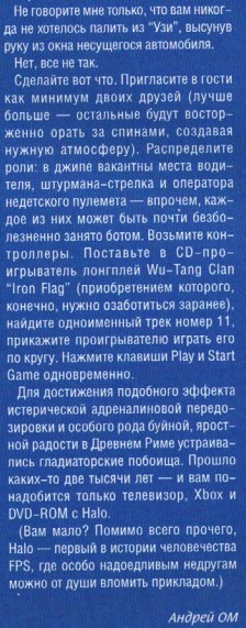 В личной номинации Андрей Ом-Подшибякин рекомендует играть в Halo под вутанговскую композицию Iron Flag на повторе. Я не стал проверять на фактику кусок про "первый в истории человечества FPS, где можно бить прикладом", а возможно стоило бы.