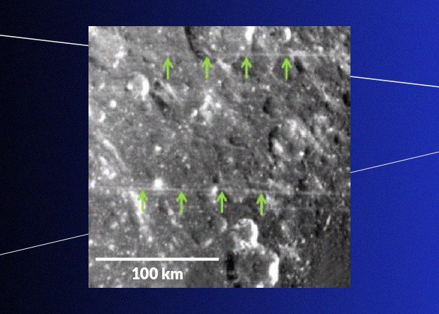 Таинственные полосы на поверхности спутника Сатурна Дионе были обнаружены еще «Вояджером», а с помощью «Кассини» несколько лет назад их удалось рассмотреть поближе. Такие полосы очень тонкие и длинные, а сейчас ученые узнали, что они еще и проходят параллельно экватору спутника. Пока что все еще непонятно, откуда они взялись, но ученые считают, что, скорее всего, они появились благодаря процессам извне