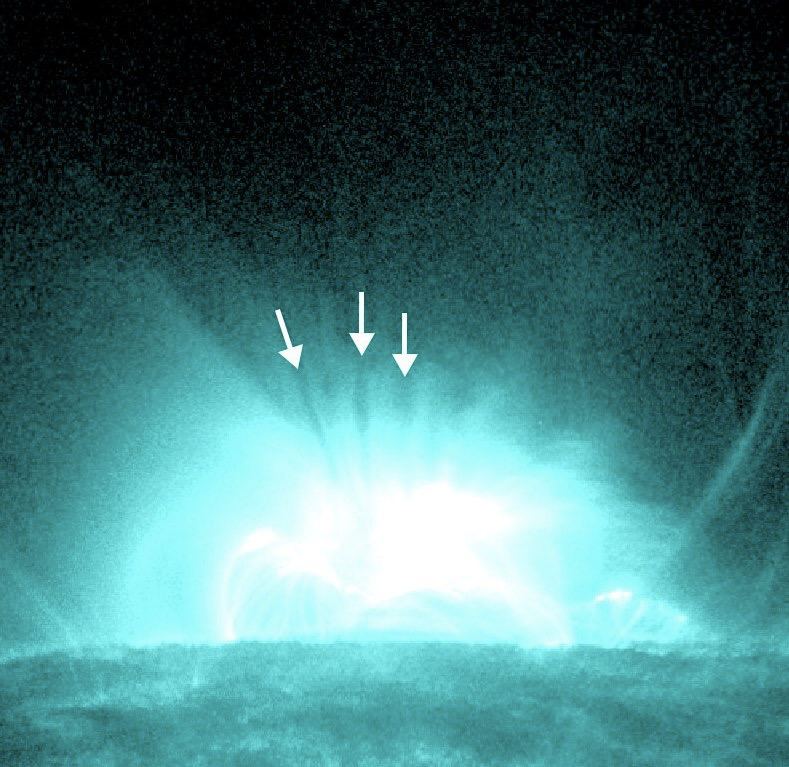 Надаркадные нисходящие потоки на Солнце были открыты 23 года назад, и до сих пор астрономы не могли точно определить природу этих странных, темных, похожих на пальцы структур, наблюдаемых во время солнечных вспышек. Однако теперь это удалось сделать. Оказалось, что потоки формируются за счет неустойчивостей Рэлея — Тейлора и Рихтмайера — Мешкова, действующими в турбулентной области над группами корональных петель