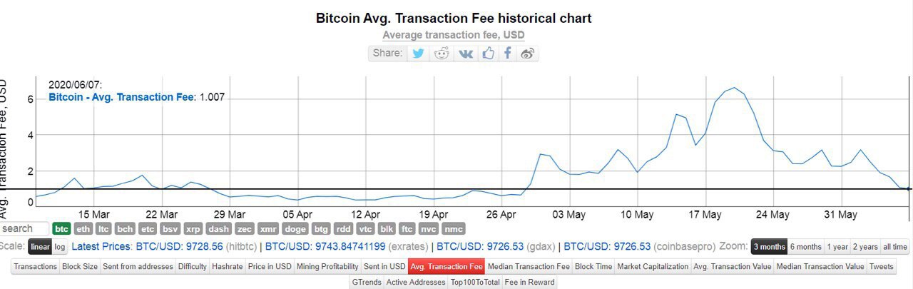 Средний размер комиссии за транзакцию BTC достиг самого низкого уровня с 28 апреля и сейчас составляет $1.007. Однако он все равно на 277% выше, чем средняя плата за транзакцию BTC в начале года.