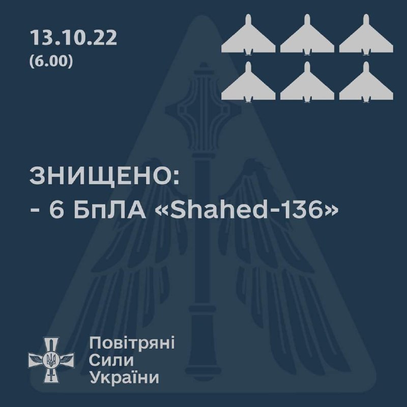 Вночі, 13 жовтня, силами та засобами протиповітряної оборони Повітряне командування "Південь" Повітряних Сил ЗС України над Одещиною збито чотири ворожих дронів-камікадзе "Shahed-136", над Миколаївщиною - два.