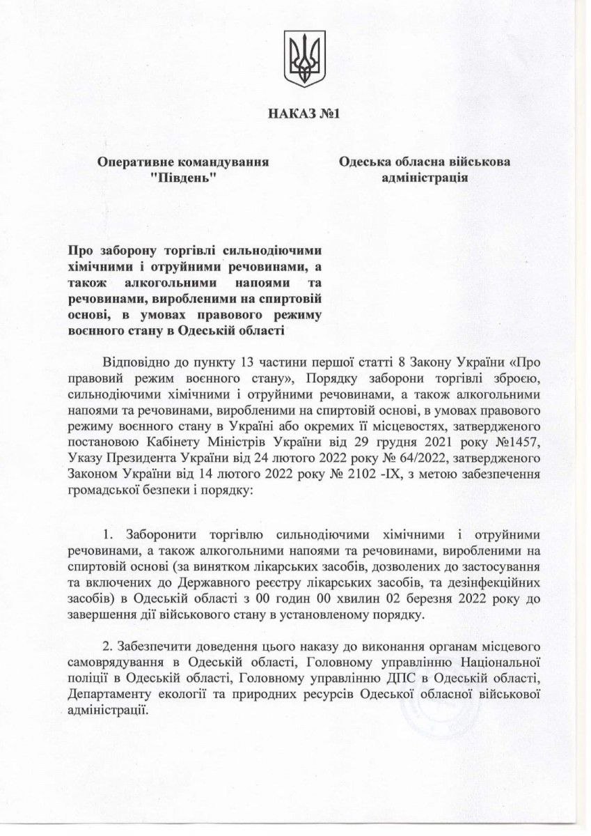 Відповідний спільний наказ про заборону торгівлі прийнято командувачем військ ОК «Південь» та начальником Одеської обласної військової адміністрації.