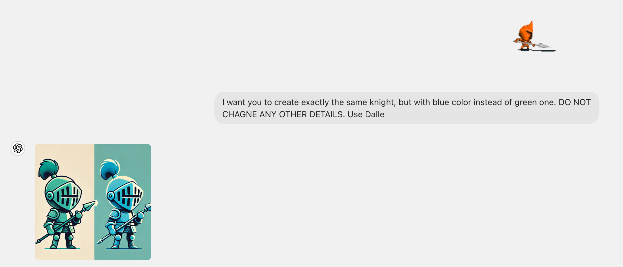 2. GPT описывает что на картинке текстом и формирует инструкцию для Dalle, мол, нарисуй рыцаря в стиле пиксель арт, с тяжелыми доспехами синего цвета