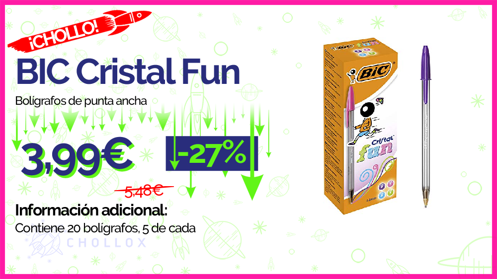 💥🔉BIC Cristal Fun - Bolígrafos de punta ancha (1.6 mm), Caja de 20 unidades, color morado, rosa, verde lima y turquesa #Amazon