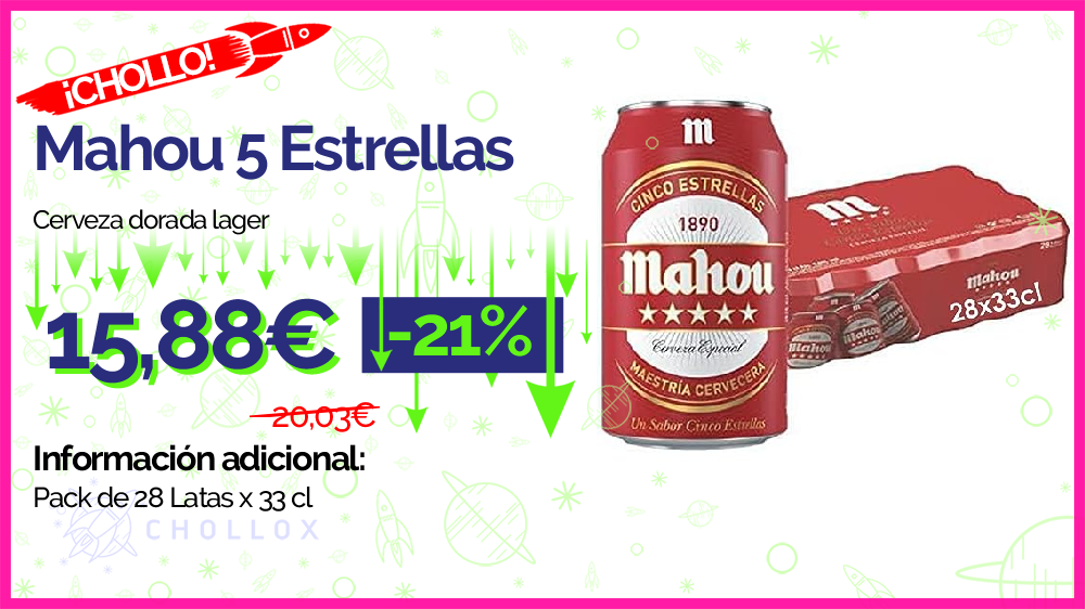 💥 🔉 Mahou 5 Estrellas - Cerveza dorada lager, Pack de 28 Latas x 33 cl #Amazon