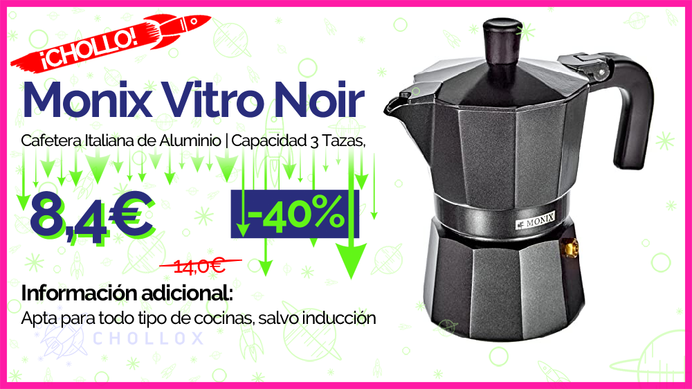 💥 🔉 Monix Vitro Noir – Cafetera Italiana de Aluminio, Capacidad 3 Tazas, Apta para Todo Tipo de cocinas Salvo inducción #Amazon