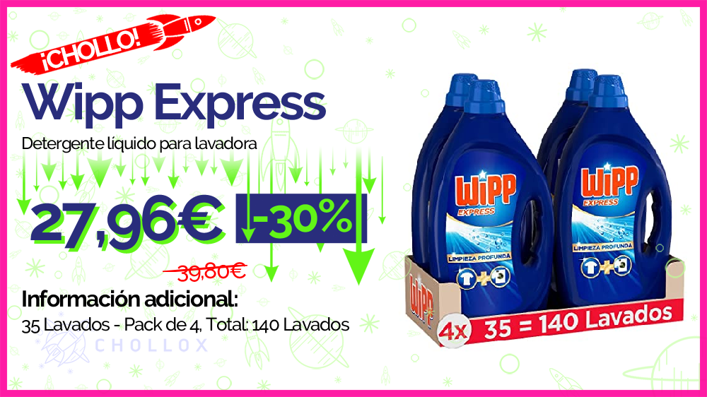 💥 🔉 Wipp Express - Detergente líquido para lavadora, 35 Lavados - Pack de 4, Total: 140 Lavados #Amazon
