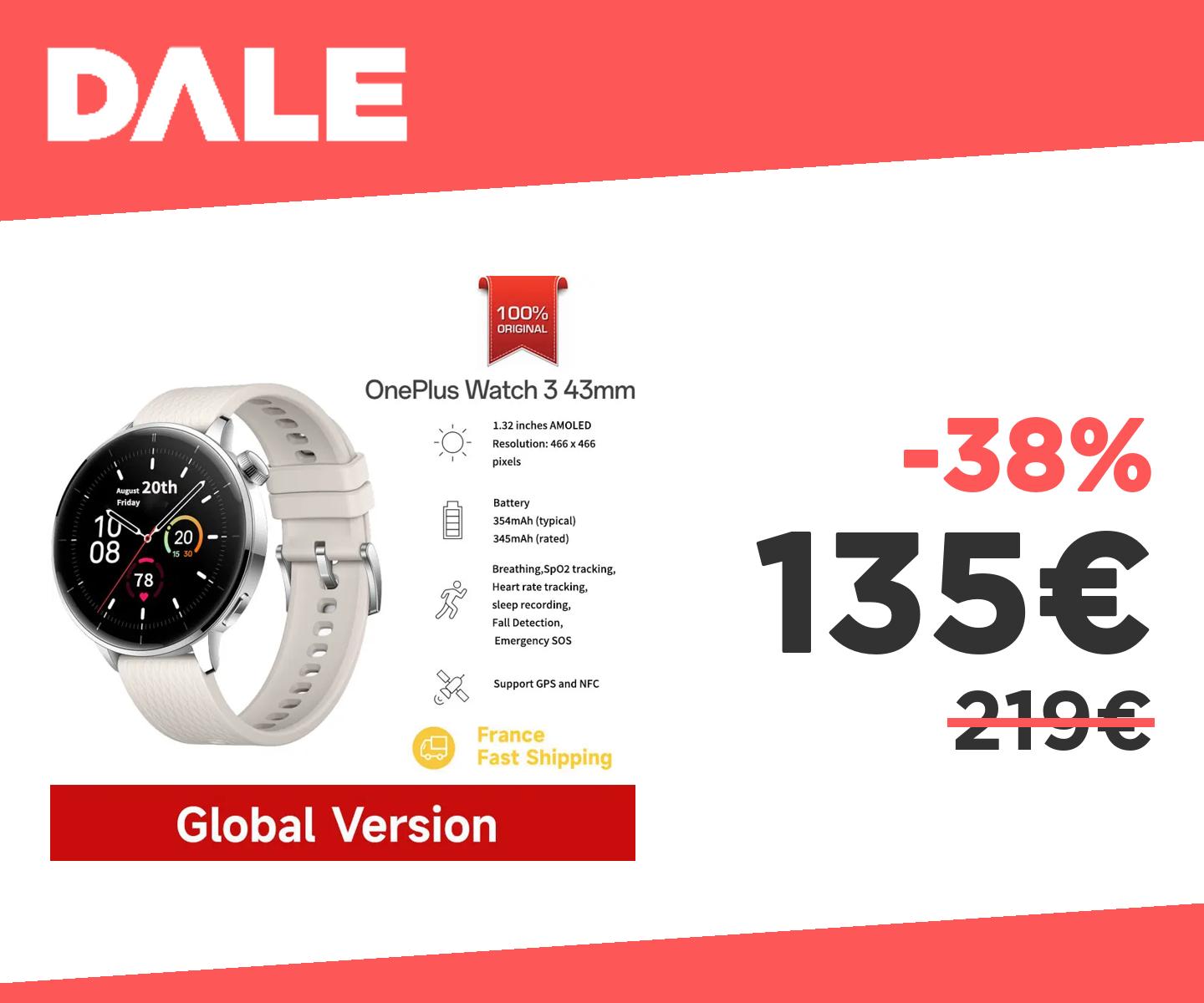 ๐ฃ OnePlus Watch 3 43mm Versione globale Smart Watch Display AMOLED da 1,32 pollici Supporto NFC GPS Chiamate Bluetooth Rilevamento caduta SpO2