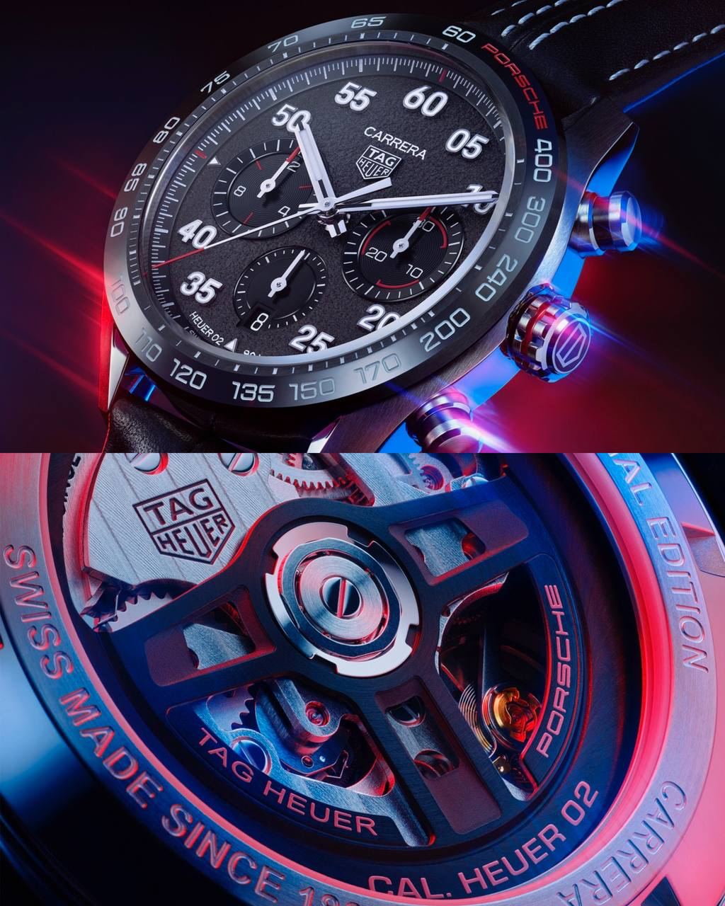 В часах используются фирменные цвета Porsche – красный, черный и серый, которые также напоминают исторические модели Heuer. На базеле часов выгравирована надпись Porsche, а в индексах использован легко узнаваемый шрифт бренда. Кроме того сквозь прозрачную заднюю крышку корпуса из сапфирового стекла четко виден ротор, стилизованный под рулевое колесо Porsche.