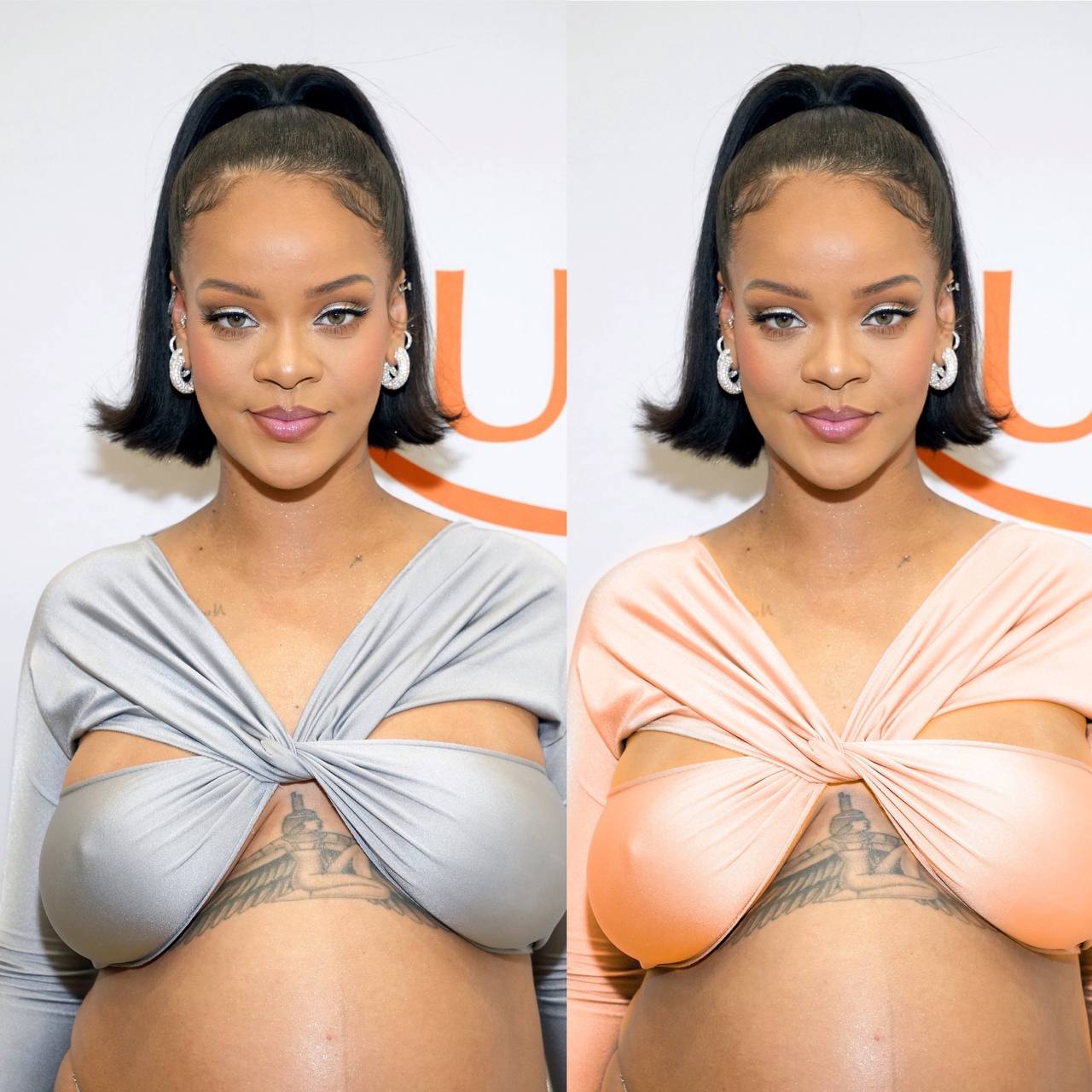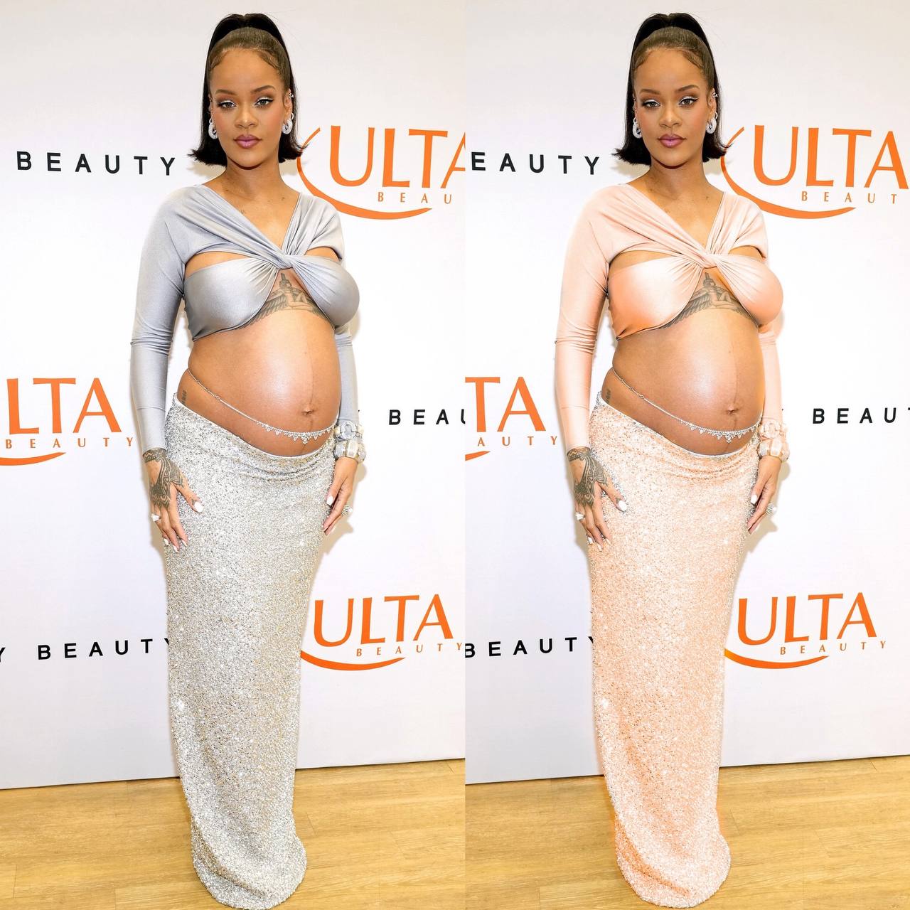 Рианна, абсолютно потрясающий выход, серий цвет был выбран идеально, поддержал ее прохладную внешность.