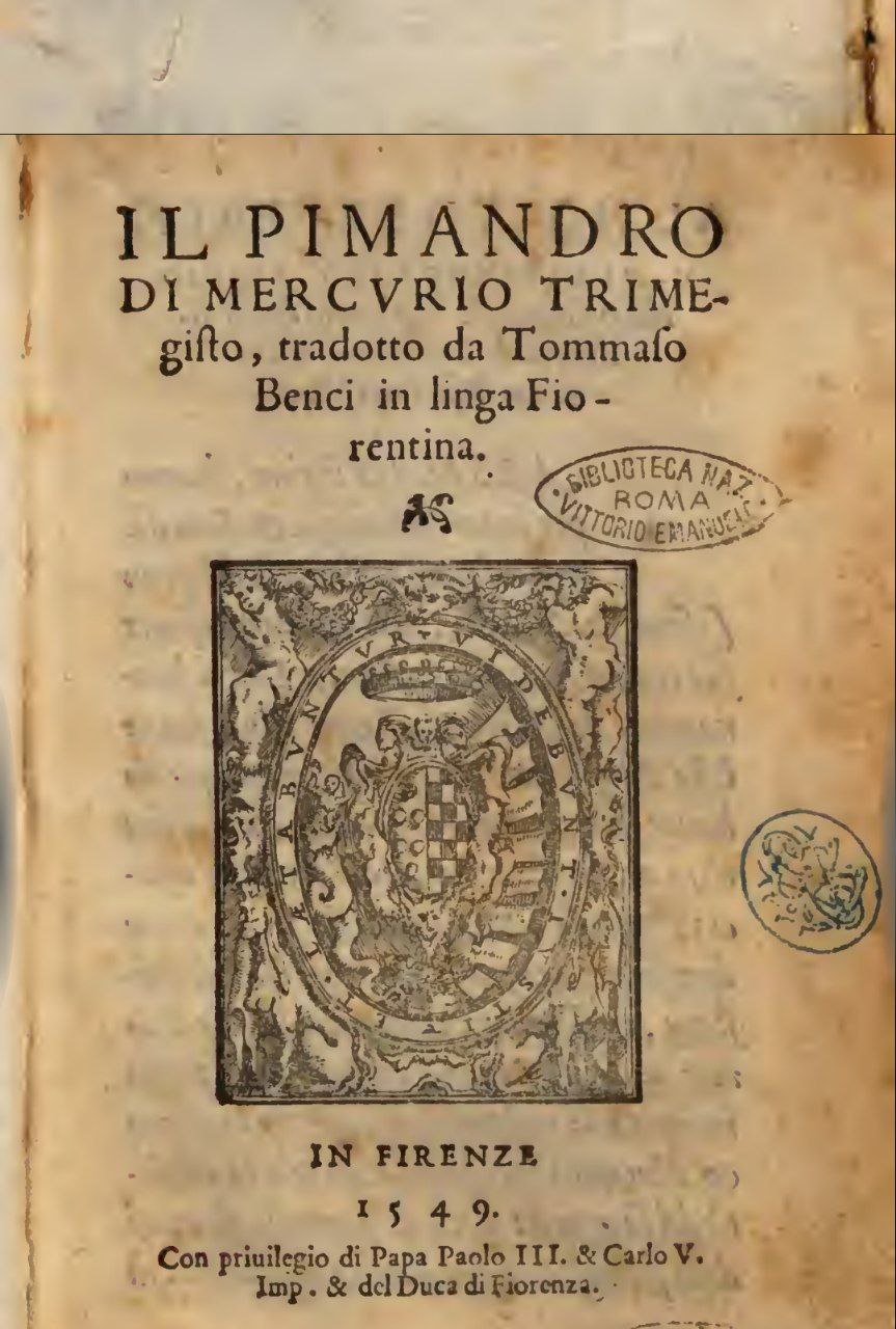 Il Pimandro di Mercurio Trimegisto, tradotto da Tommaso Benci in lingua fiorentina