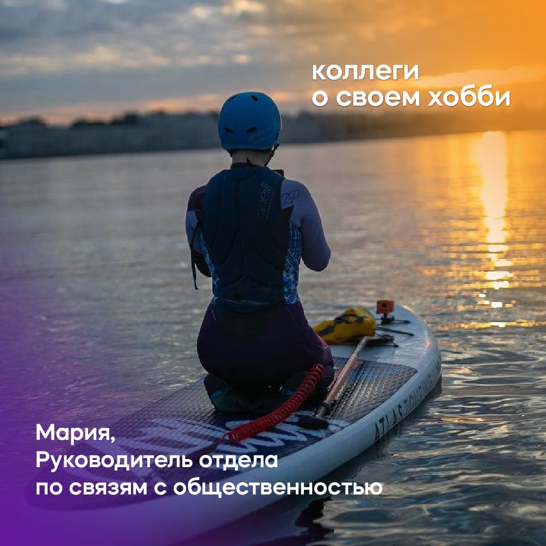 Мария, руководитель отдела PR, уже 4 года занимается сапбордингом (от англ. "supboarding"), и говорит, что это помогает ей справляться со стрессом 😅