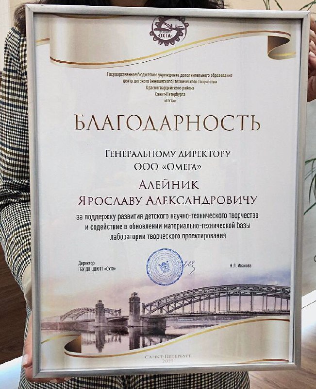 Вот такую благодарность СЕО Омеги Ярослав Алейник получил от ГБУ Центр детского (юношеского) технического творчества Красногвардейского района Санкт-Петербурга«ОХТА» 🚀