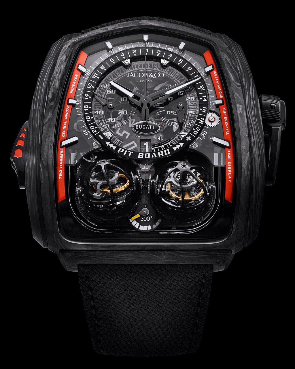 Бугатти говорит, что часы оснащены двумя ускоренными турбийонами с тремя осями, которые “работают вместе, чтобы компенсировать влияние гравитации на точность движения”.