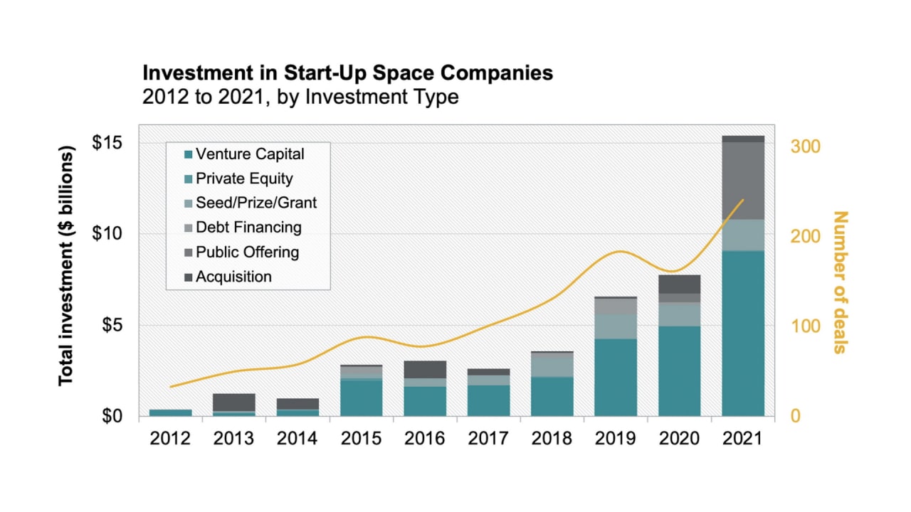 Согласно отчёту, опубликованному занимающейся анализом космической отрасли фирмой BryceTech, в 2021 году инвесторы вложили в молодые космические компании 15,4 миллиарда долларов, что вдвое превышает аналогичный показатель за 2020-й – 7,7 миллиарда долларов. В отчёте утверждается, что количество сделок по сравнению с 2020 годом увеличилось на 48%, средний объём сделки – на 35%, а число компаний, получивших инвестиции – на 46%.