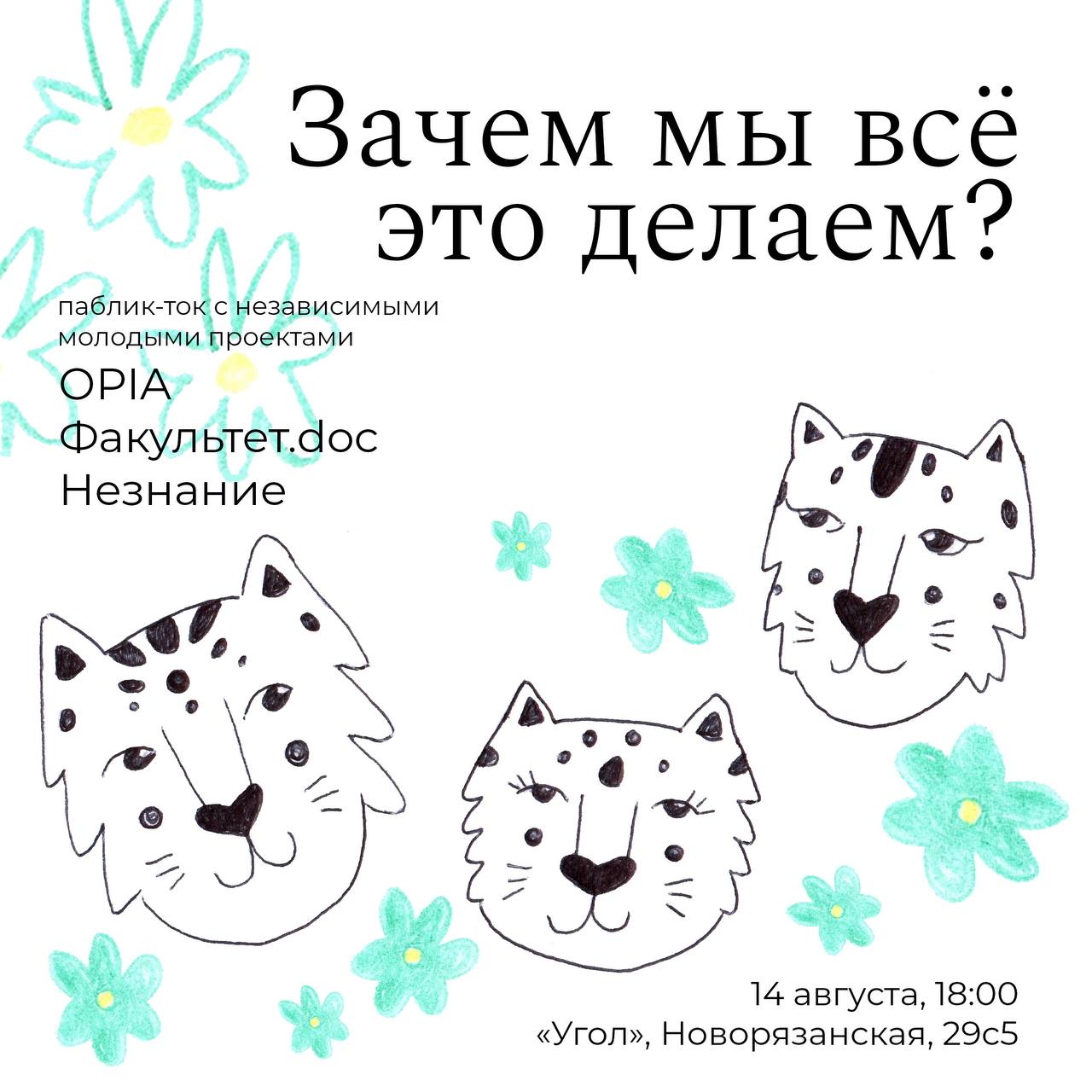 Мы начнём в 18:00 с разговора про то, как и зачем сейчас делать культурные проекты (участвуем мы, журнал «Незнание» и лаборатория Факультет.doc) — обсудим, зачем вообще мы всё это делаем, и расскажем любопытные (и крипи) истории из нашего опыта.