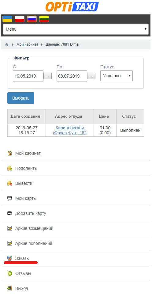 Для того чтобы просмотреть историю онлайн заказов необходимо в меню выбирать пункт "Заказы".