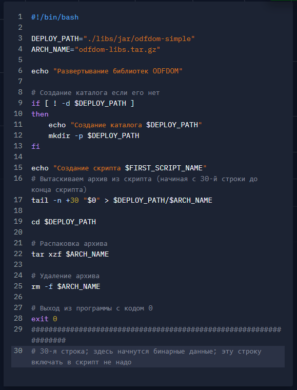 $ tail -n +30 "$0" > $DEPLOY_PATH/$ARCH_NAMEкоторая в данном случае извлекает бинарные данные и перенаправляет вывод в файл ./libs/jar/odfdom-simple/odfdom-libs.tar.gz.