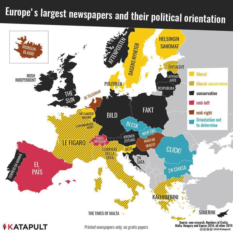 Каковы политические прдпочтения самых больших газет в европейских странах?