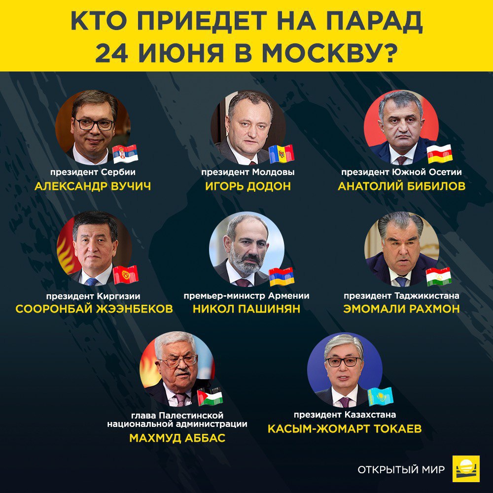 Несостоявшийся 9 мая военный парад в честь годовщины победы в ВОВ перенесли на 24 июня. Кто из зарубежных лидеров выразил желание приехать в Москву?