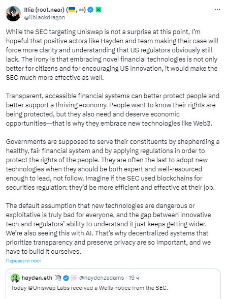 🗣Реакция фаундера Near Protocol Ильи Полосухина на wells-уведомление, которое получил Uniswap от SEC: