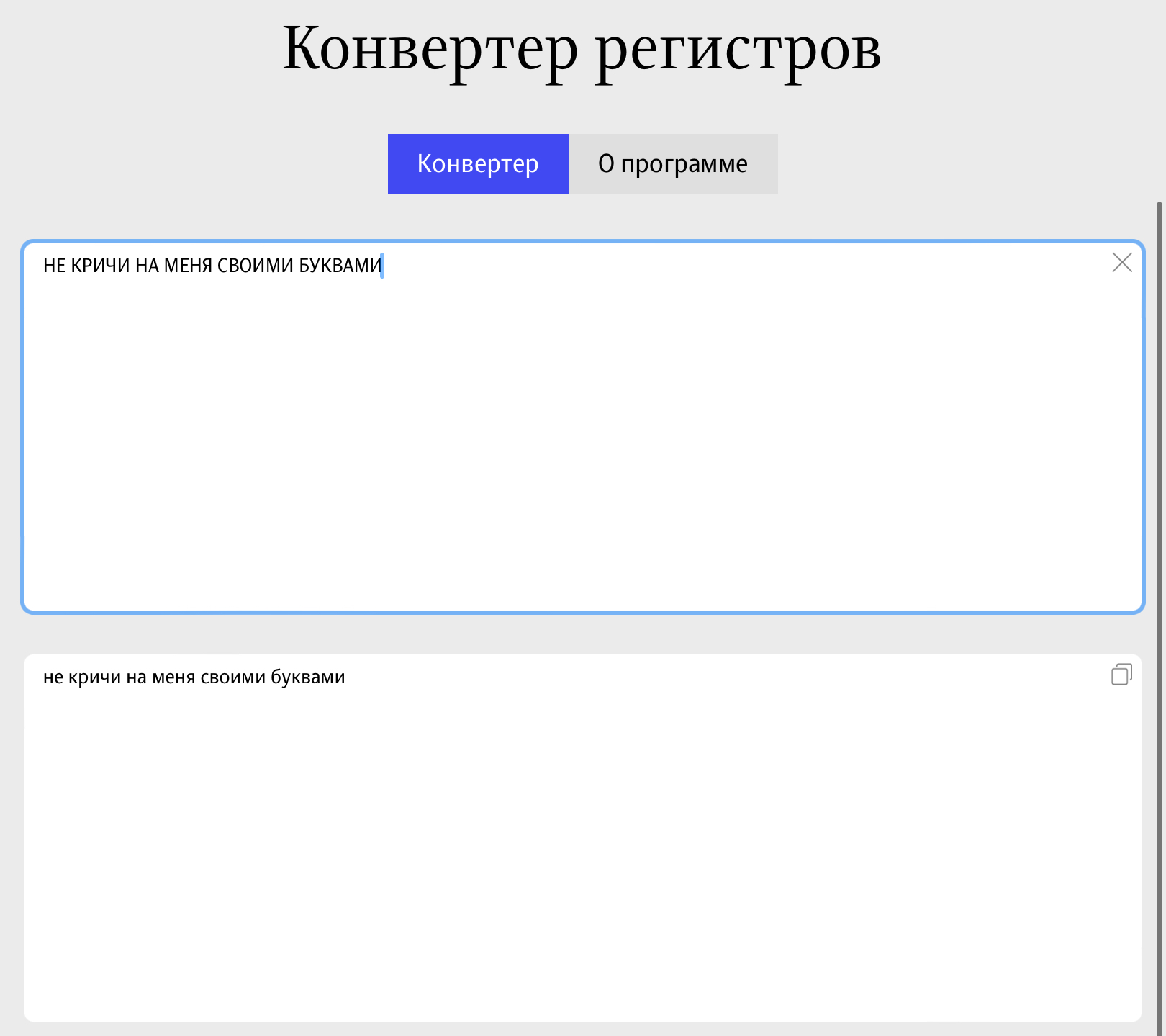🔘 Конвертер регистров сильно упрощает работу над текстом, когда нужно быстро перевести текст, написанный капс-локом, на строчные буквы (и наоборот). Ещё можно выбрать режимы «Заглавными Буквами» и «иНВЕРСИЯ рЕГИСТРА».
