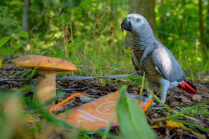 Всего несколько метров от старта parkrun Зеленоград. Белый гриб, попугай Гера и бейдж руководителя паркрана!