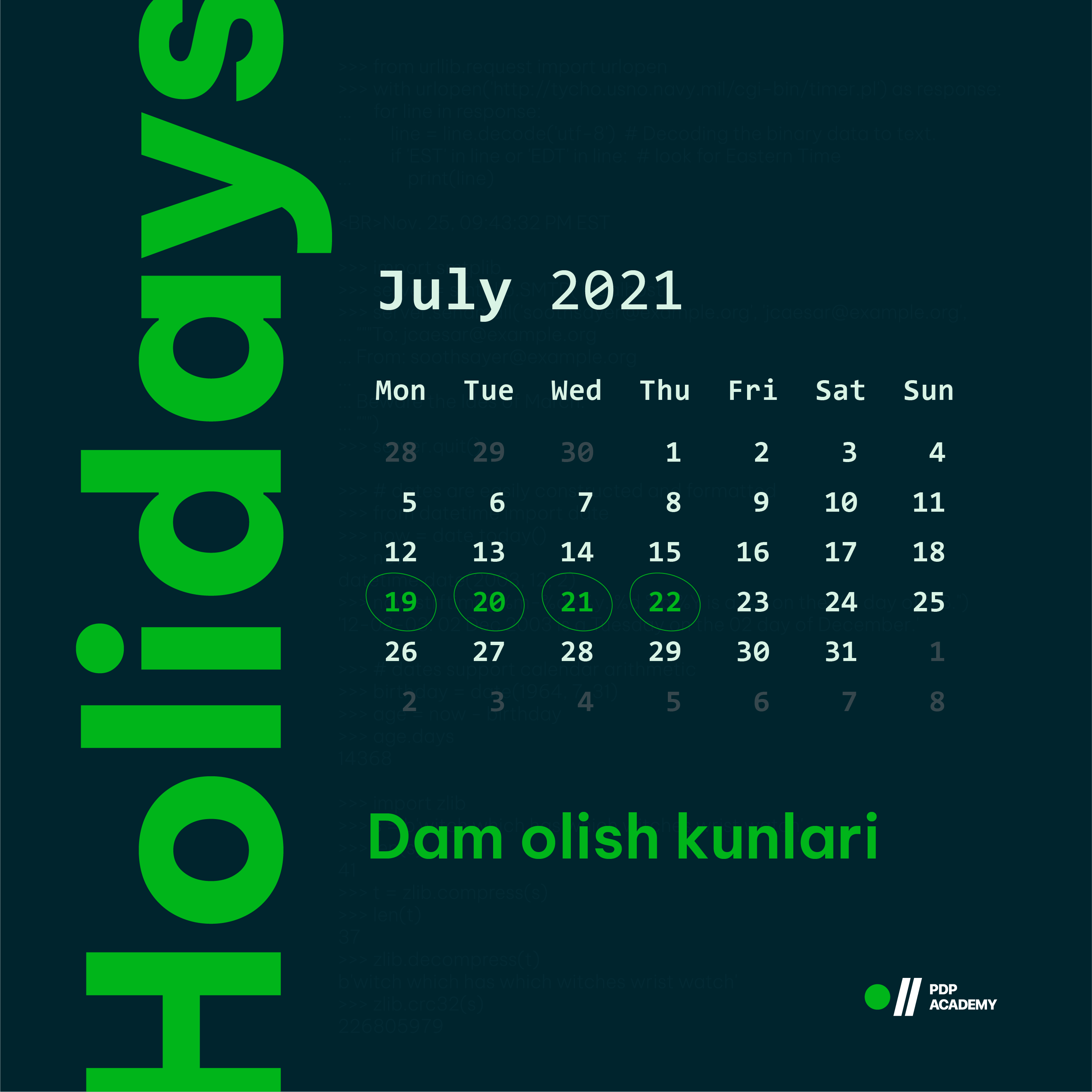 🗓 Qurbon hayiti munosabati bilan 9–12-iyul dam olish kunlari sifatida belgilandi.
