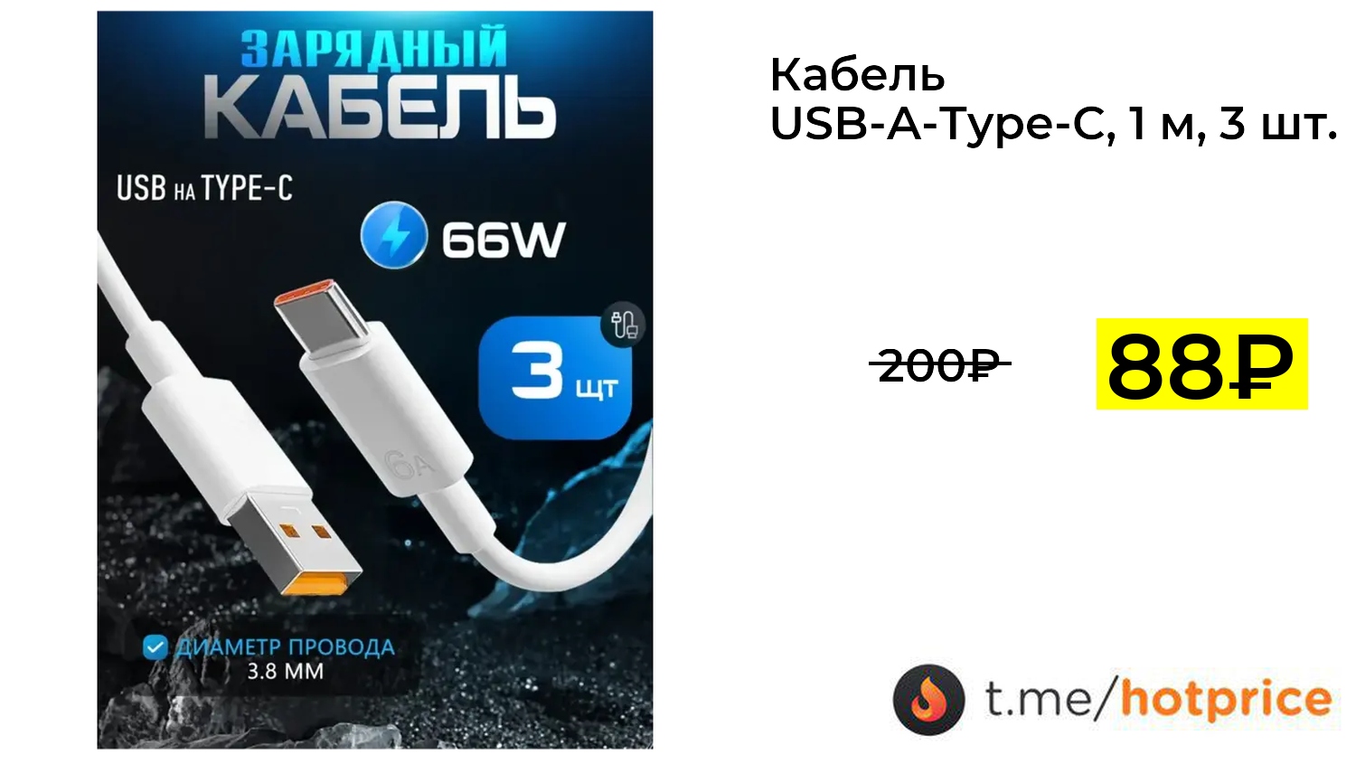 🔹 Кабель USB-A-Type-C, 1 м, 3 шт. за 88₽ ❗️ (везде: 200+₽)