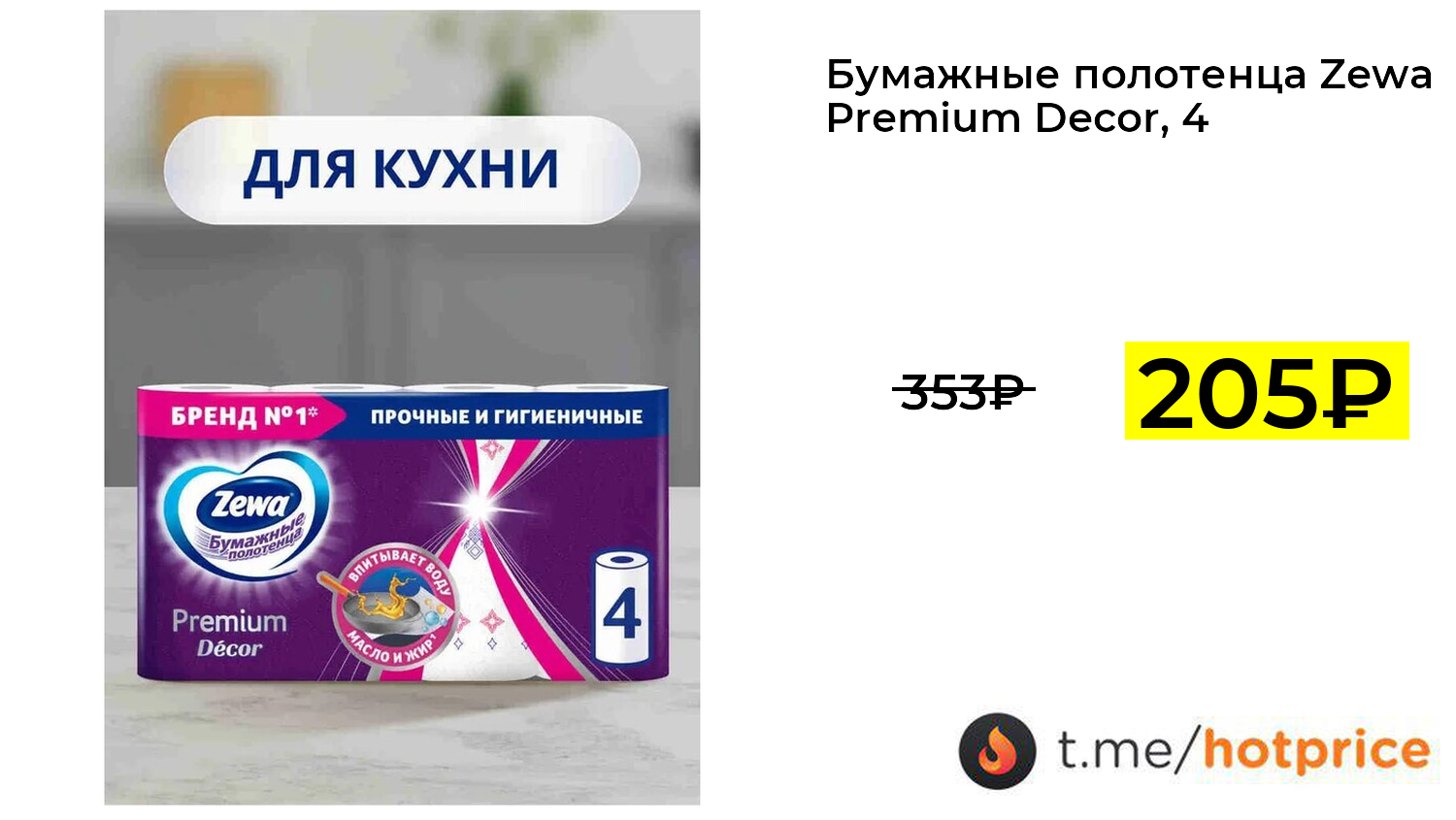 🔹 Бумажные полотенца Zewa Premium Decor, 4 рулона (с картой OZON) за 205₽ ❗️ (везде: 353+₽)