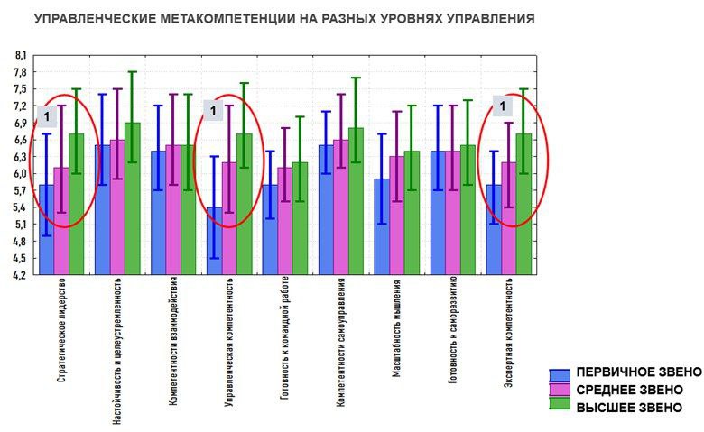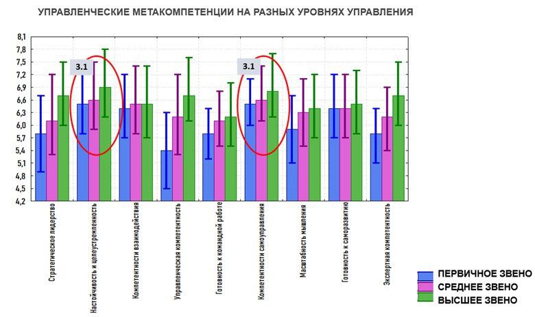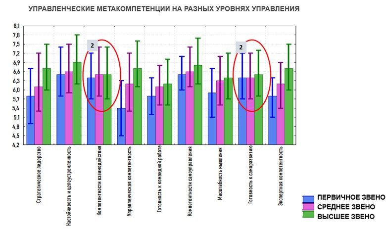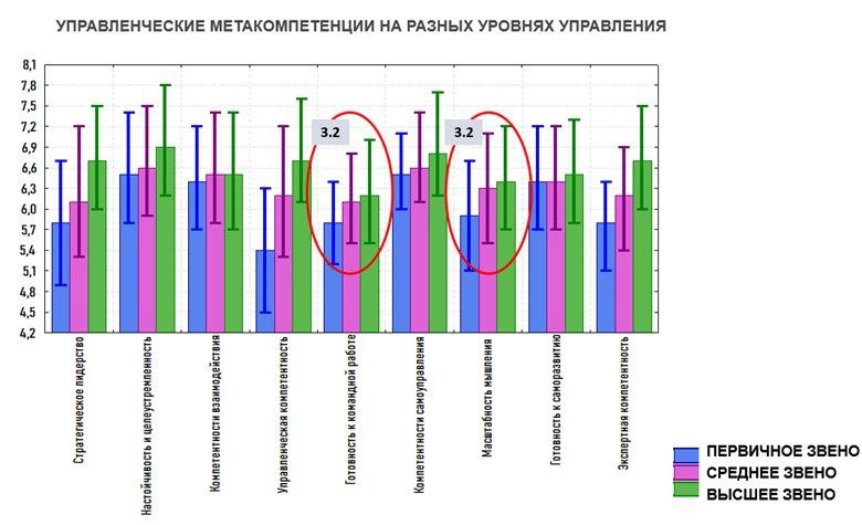 можно выдвинуть гипотезу, которая подтверждается ранее полученными результатами и позволяет их уточнить. Есть три метакачества, которые являются главными факторами карьерного роста, с одной стороны, и/или, с другой стороны, наиболее интенсивно развиваются при переходе руководителей с уровня на более высокий уровень должности. Что на что влияет, может быть предметом отдельного анализа (для перехода на более высокую должность нужен определенный уровень компетенций, или уже после повышения в должности именно эти компетенции развиваются?).