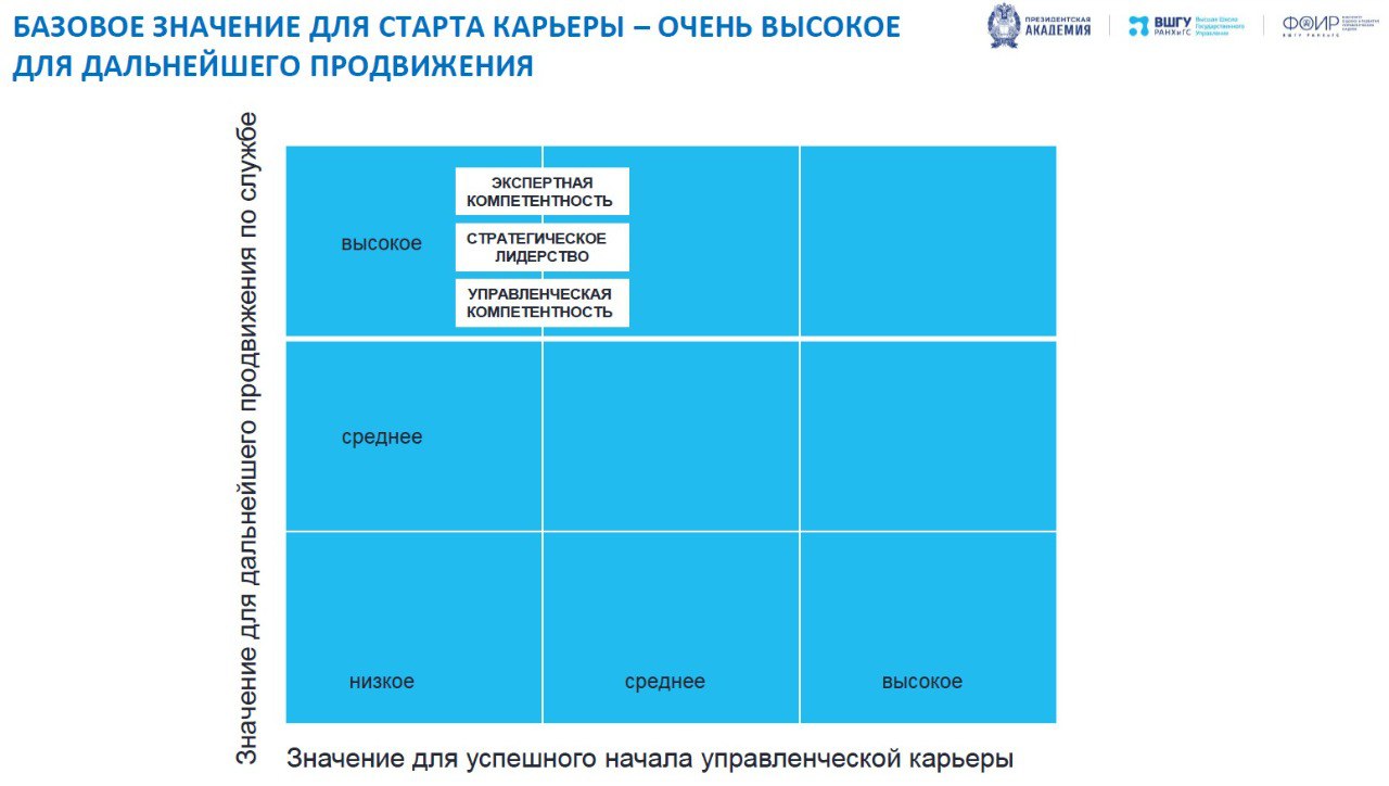 Я оценил каждую из компетенций по 3-балльной шкале: слабое, среднее, сильное влияние на успешный старт и на последующее продвижение по служебной лестинице. И вот, что получилось.
