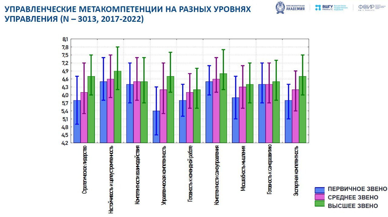 📊 Такой подход и валидизация инструментов оценки относительно реальных уровней управления позволяет получать сопоставимые данные как по руководителям разных уровней, так и в разрезе по отраслям, регионам или управленческим командам, а также использовать так называемые бэнчмарки для оценки кадрового состава того или иного региона, ведомства или отрасли в целом.