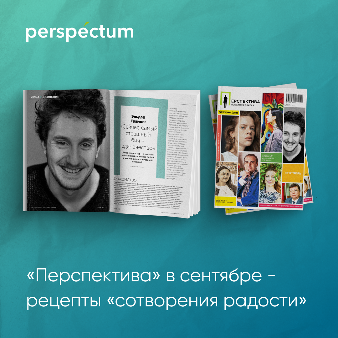 Что такое осень – это небо, плачущее небо под ногами… А еще – сентябрьский номер журнала «Перспектива». В нем, к счастью, никто не плачет, напротив, молодые герои «Перспективы» ищут свет, смысл и вдохновение в каждом эпизоде своей творческой жизни и щедро делятся с нами собственными рецептами «сотворения радости». Актер и режиссер Вахтанговского театра Эльдар Трамов видит залог счастья в том, чтобы отдавать: «у кого много – тому прибавится, а у кого мало – у того и отнимется». Художница Лазиза Тулаганова из Узбекистана находит сюжеты для своих картин в разговорах с людьми и путешествиях. Туркменский композитор и пианист Мамед Гусейнов не мыслит себя без семьи, народной музыки и стихов Махтумкули – «солнца туркменской поэзии». Белорусская писательница Анна Зенькова призывает верить, что из любой ситуации, из любой истории всегда есть выход. Армянский химик Мариета Закарян убеждена, что счастливой ее делают родная земля и наука. Прислушайтесь к совету эстонской модели и актрисы Аделе Таска: если вам говорят «нет» - это еще не конец света, то, что ваше мимо никогда не пройдет.