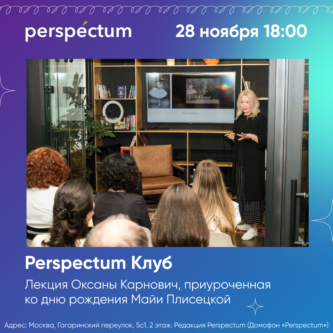 Клуб Perspectum приглашает ценителей балета и театрального искусства на встречу, посвященную дню рождения выдающейся танцовщицы Майи Плисецкой. Об актрисе, которой рукоплескал весь мир, о судьбе, непростой, но яркой и поистине высокой, как ее легендарный сценический прыжок, рассказывает кандидат искусствоведения, педагог кафедры хореографии и балетоведения Московской государственной академии хореографии, директор музея-квартиры М.М. Плисецкой – Оксана Карнович.