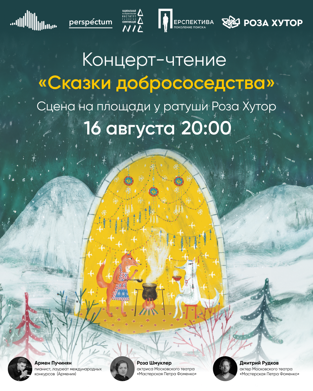 В течение недели под южным августовским небом будут звучать романсы, симфоническая и оперная музыка, а 16 августа (пятница), в 20:00, на сцене у ратуши Роза Хутор состоится литературно-музыкальный концерт «Сказки добрососедства» - подарок издательства Perspectum гостям и участникам фестиваля.