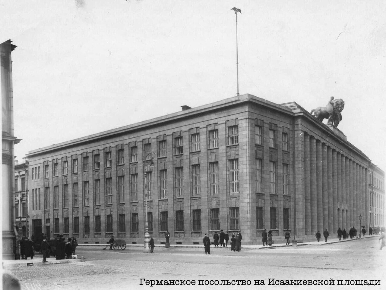 После митинга на Невском просп. огромная толпа манифестантов с флагами и портретами обожаемого Монарха направилась по Невскому просп., а затем по улице Гоголя /ныне Малая Морская — прим.ред./ к германскому посольству.