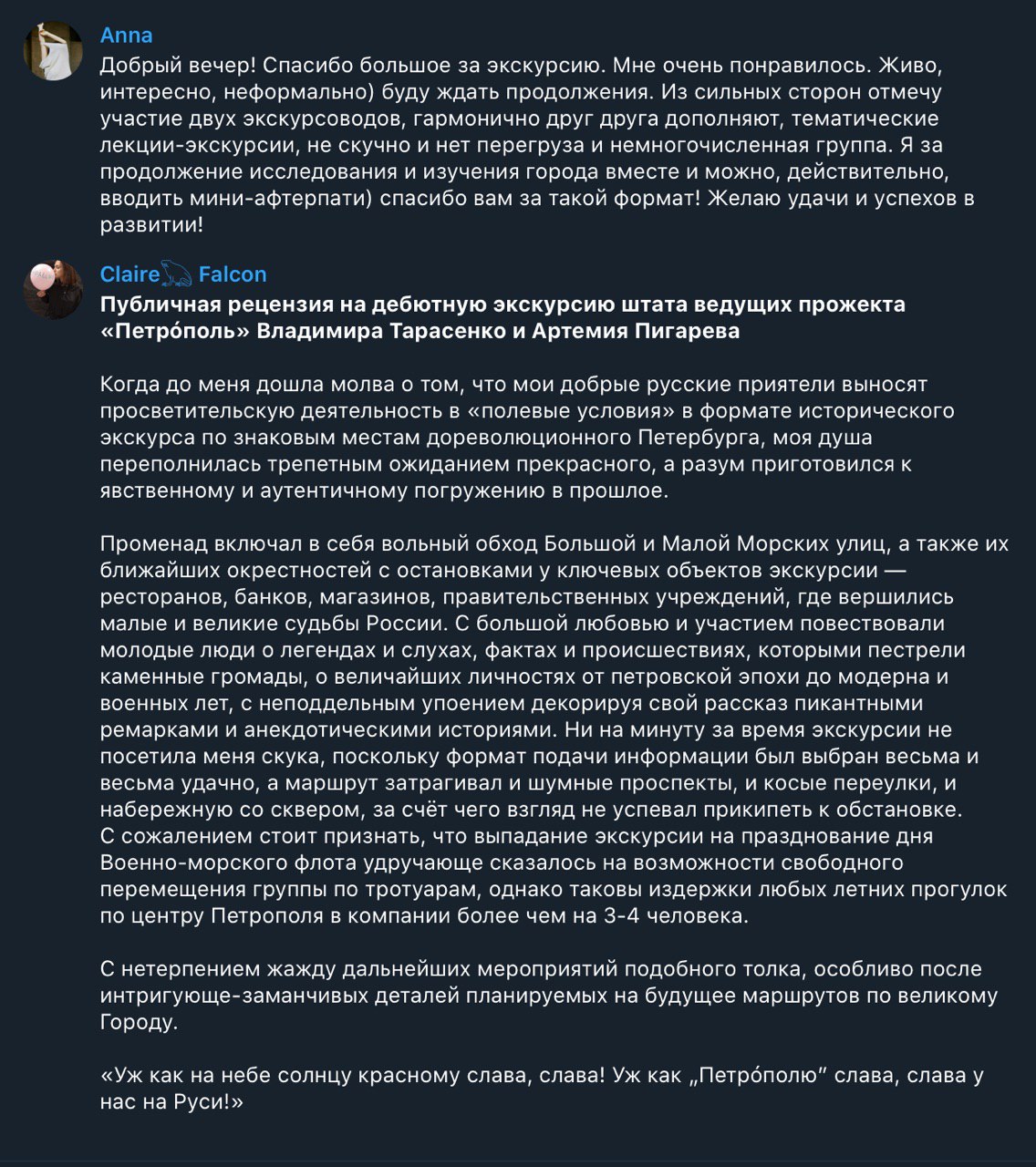 Дорогие друзья, в прошедшее воскресенье успешно состоялась первая экскурсия, организованная нашими силами. Мы прогулялись по обеим Морским улицам и их окрестностям — самому сердцу Адмиралтейской части, бывшей некогда центром светской жизни имперской столицы. Спешим поделиться отзывами двух очаровательных участниц экскурсии — Анны и Светланы. Отзывы прикреплены в конце этого поста.